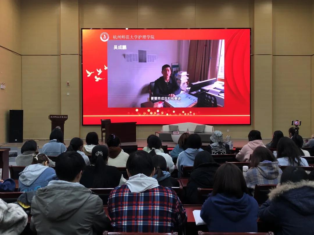 活动伊始,主持人为大家播放了校友吴成鹏的寄语视频。吴成鹏,1994年11月生,浙江温岭人,2013年12月入党,2016年9月参加工作,硕士研究生学历,法律硕士学位,杭州师范大学医学院2016届校友,现任省直机关公职律师。吴成鹏校友由于工作原因无法到达现场,特为学弟学妹们录制了寄语视频来和大家分享他大学四年的规划与学习生活方式。