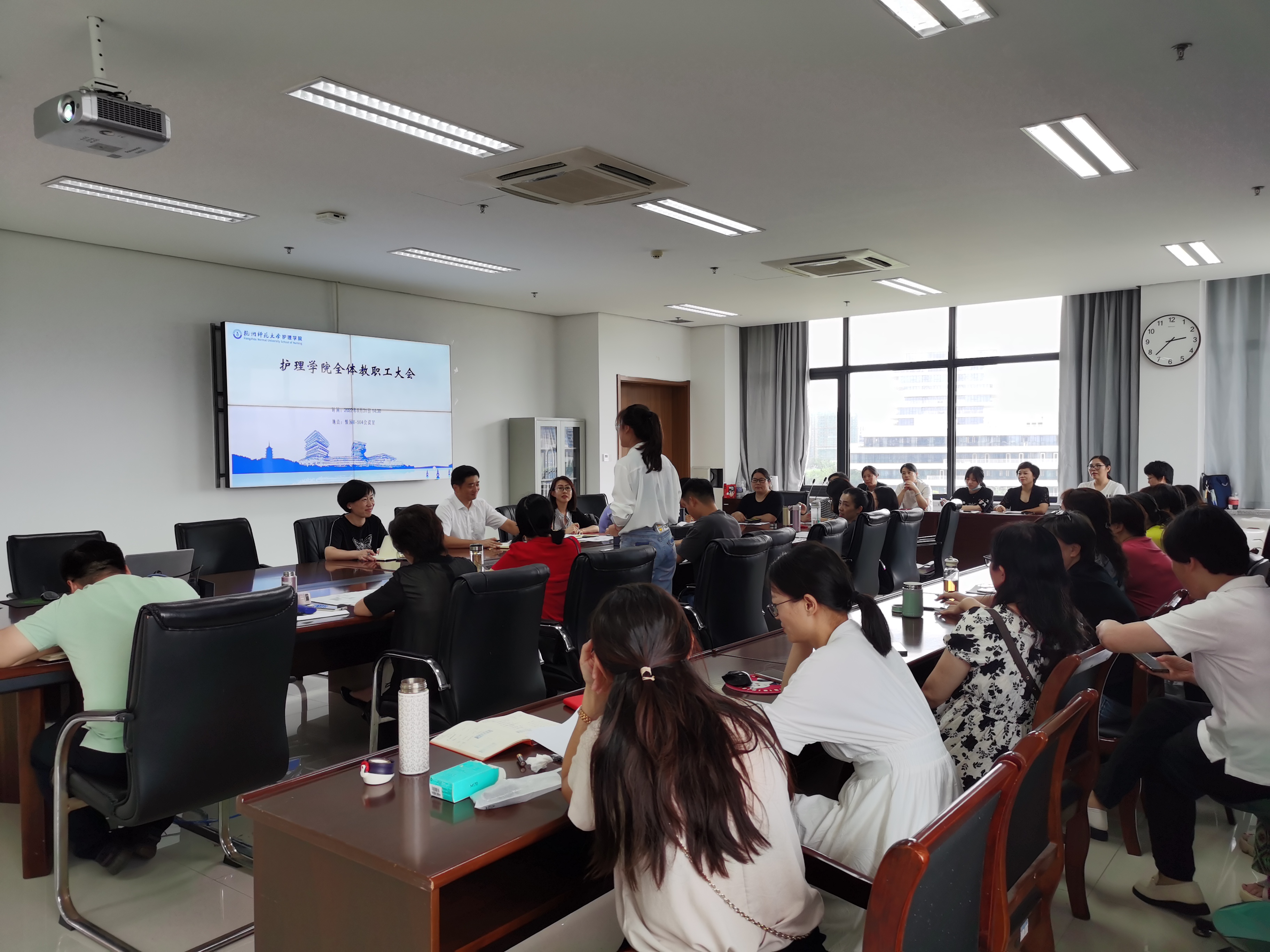 2022年8月31日下午,护理学院召开新学期教职工大会,学院党总支书记汪胜、副院长朱雪娇、院长助理张晶及全体教职工出席会议。