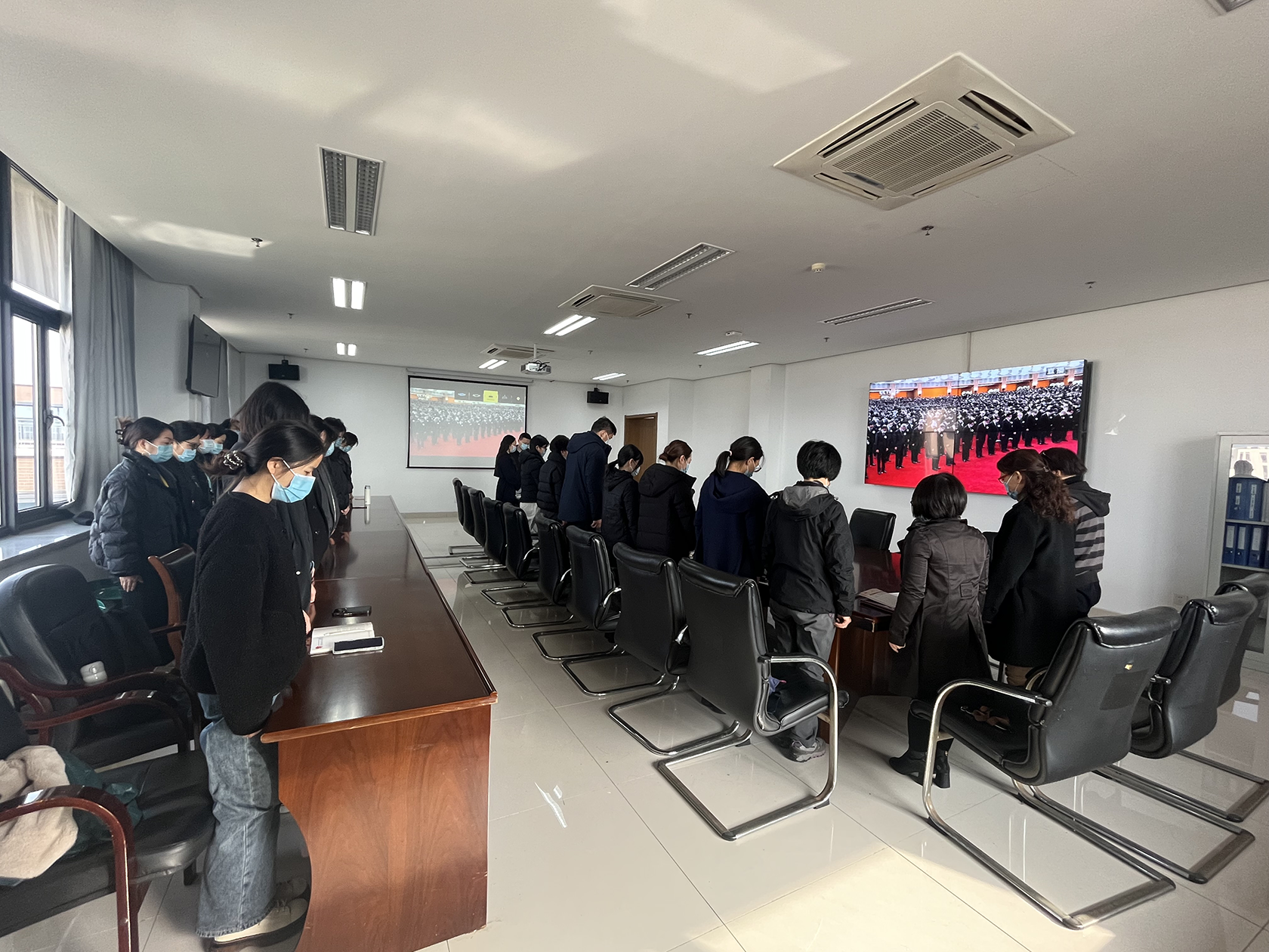追悼大会上,全体人员为江泽民同志默哀三分钟,缅怀江泽民同志,寄托对江泽民同志的无比崇敬和深切悼念。