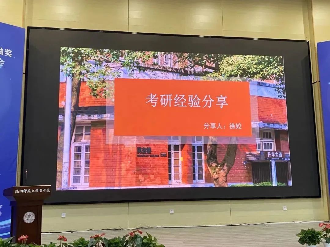 接着学生代表20级国奖获得者潘惠芯同学同样也从为什么考研和怎么做向我们展示了她考研的决心和动力。考研就是要有恒心、耐心、信心和决心,潘同学的一席话鼓舞了不少同学。