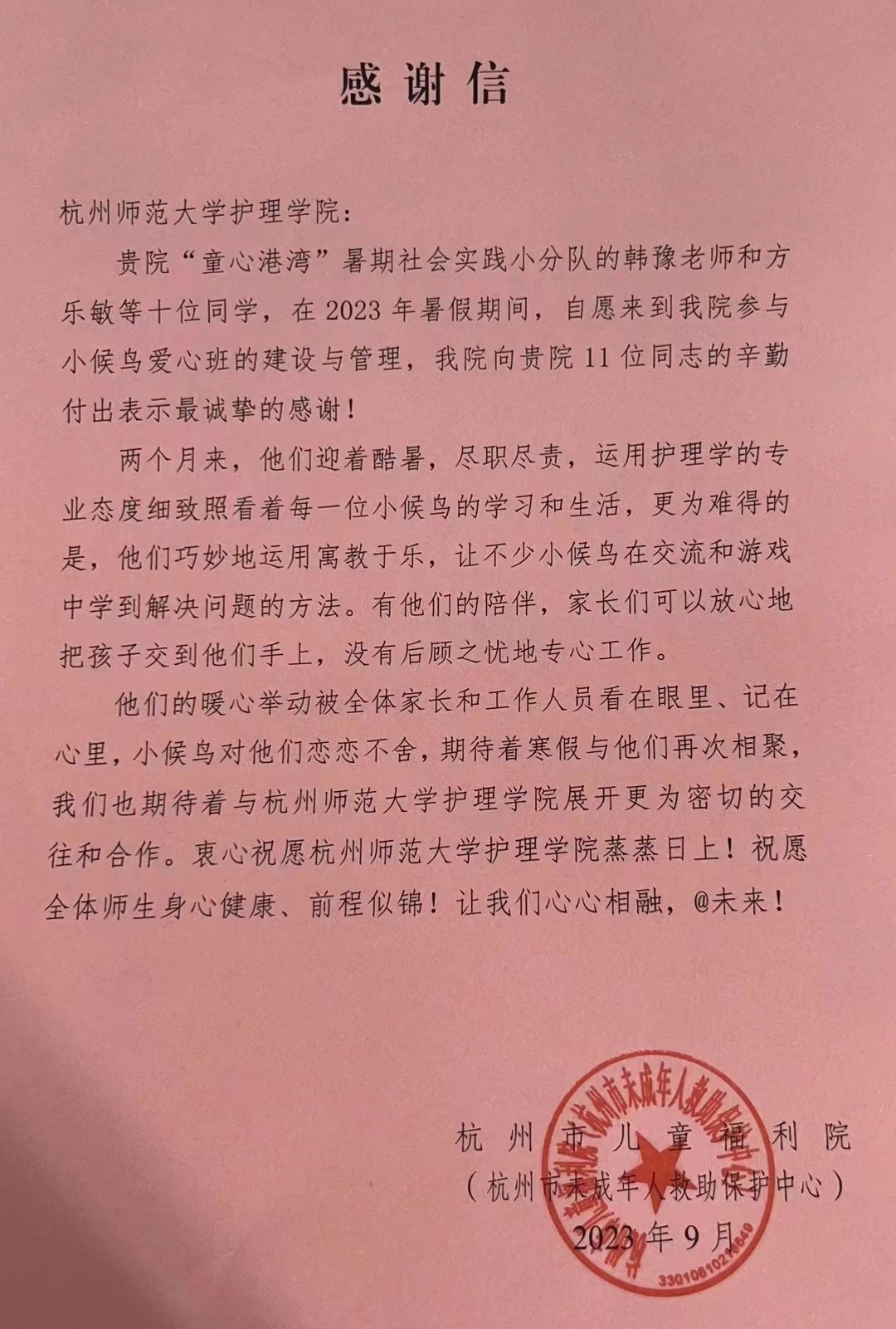 2023年9月,我院收到了一封来自杭州市儿童福利院的感谢信。
