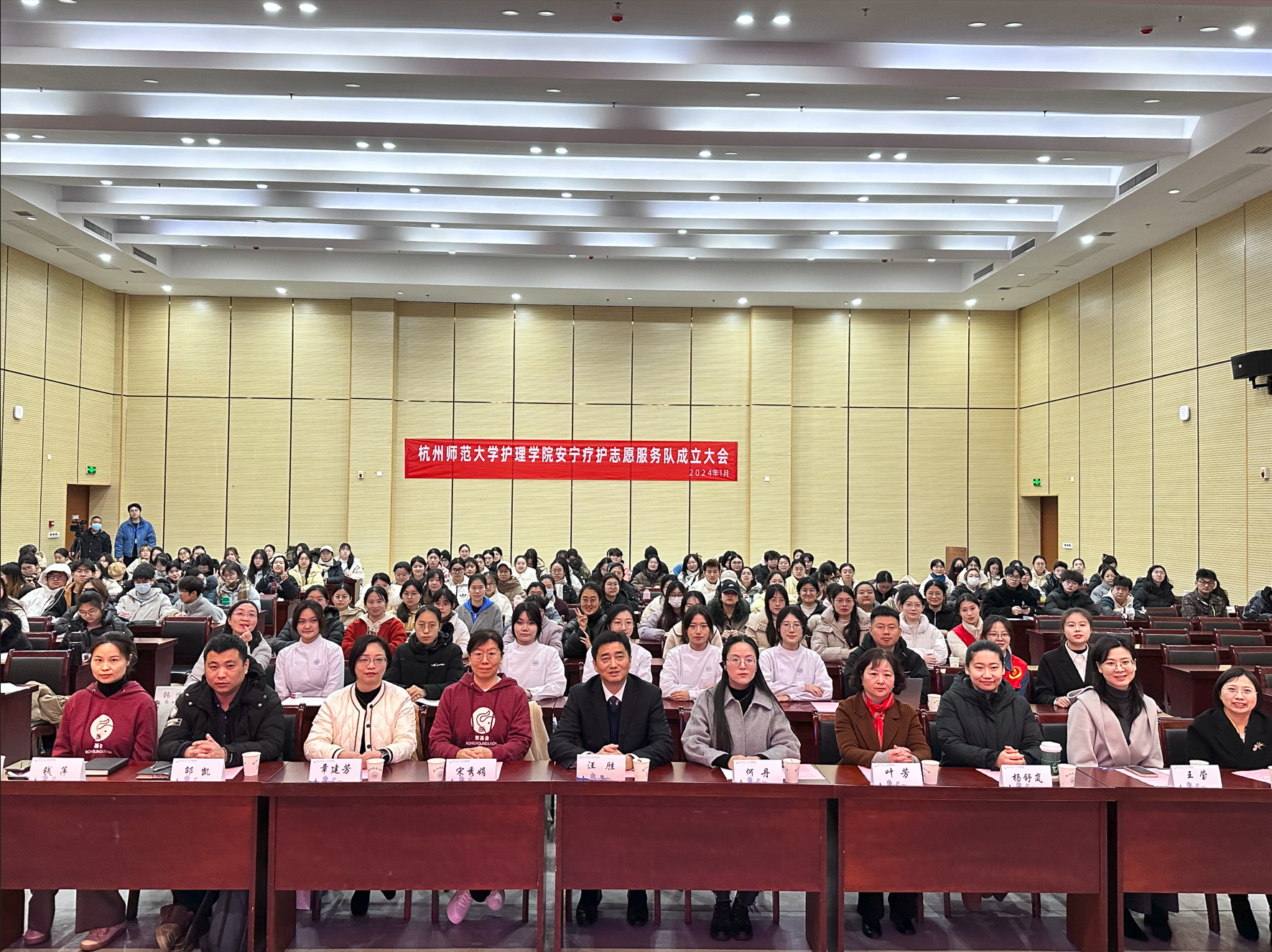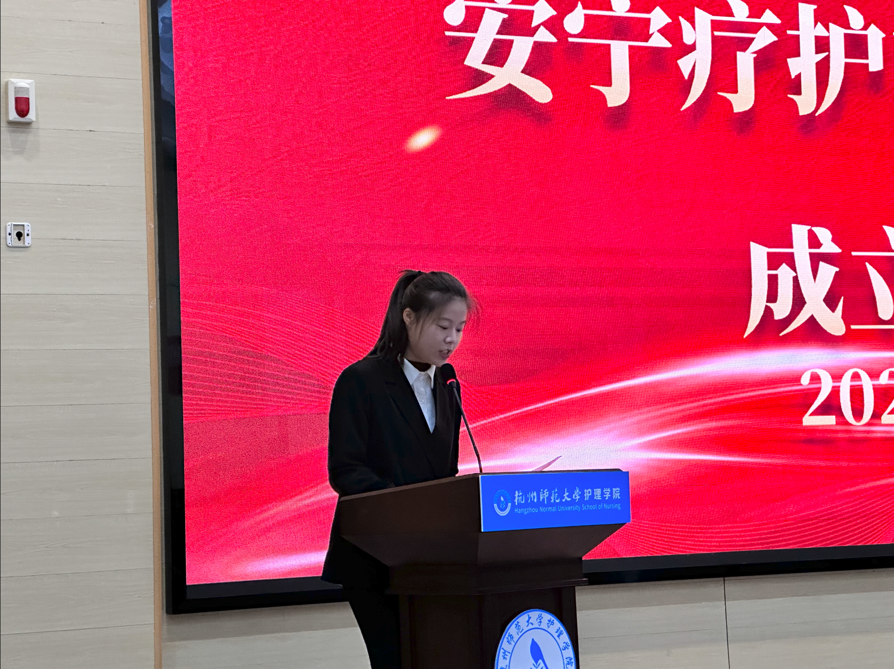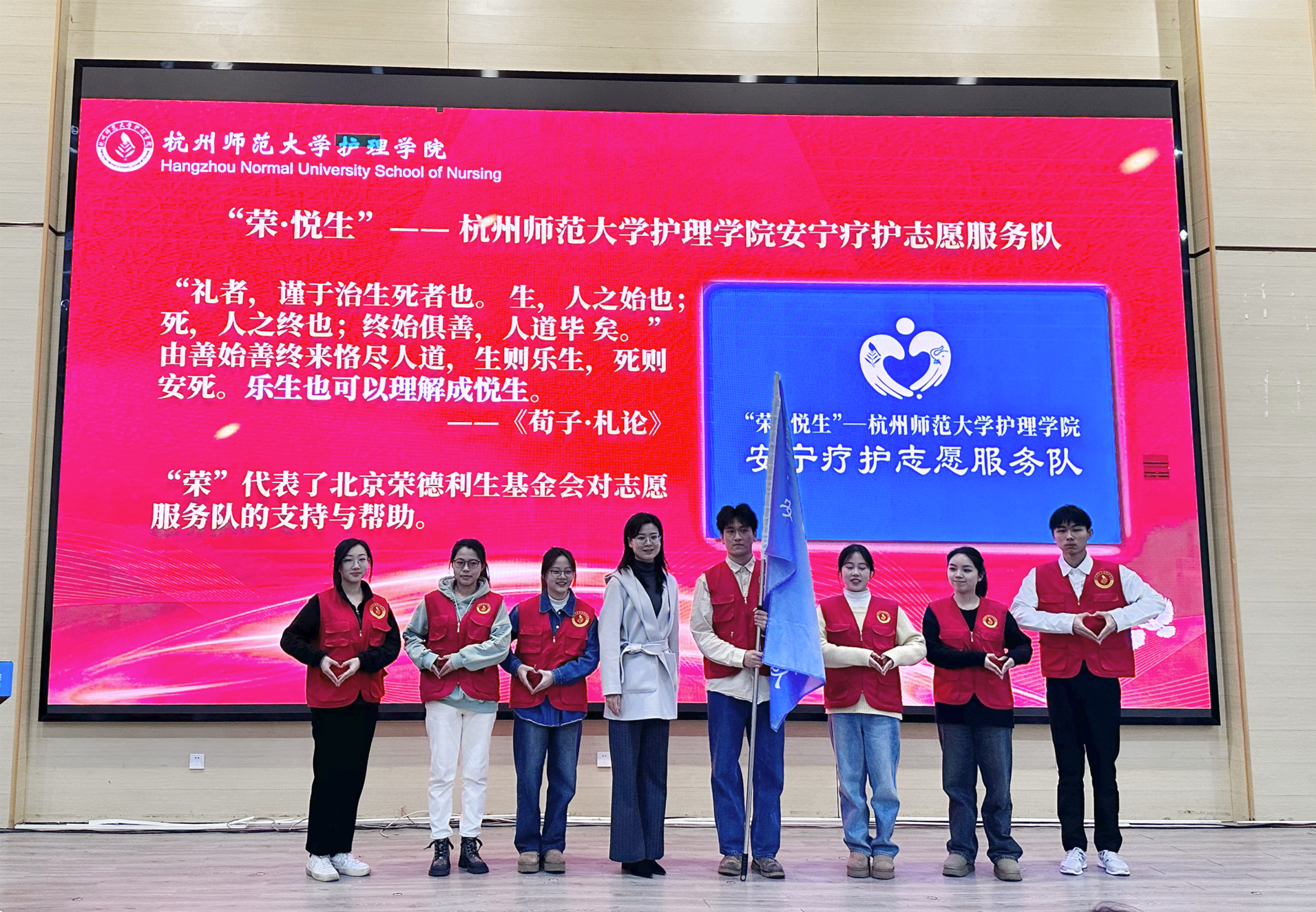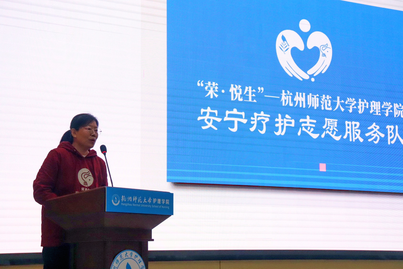 近日,杭州师范大学护理学院“大学生安宁疗护志愿服务队成立大会”在我校仓前校区隆重举行。莅临本次活动的校外嘉宾有杭州市卫生健康委老龄健康处代表何丹、北京荣基金在杭志愿者队伍负责人宋秀娟、浙江老年关怀医院护理部主任叶芳、杭州市肿瘤医院护理部副主任章建芳、浙江医院医疗照护病房副护士长杨舒岚、拱宸桥街道宸运社会组织服务中心安宁康养负责人邵凯。校团委志愿者指导中心主任王莹、我院党总支书记汪胜、我院副院长楼妍、学院师生参加大会。本次大会由护理学院辅导员郑俏芸主持。