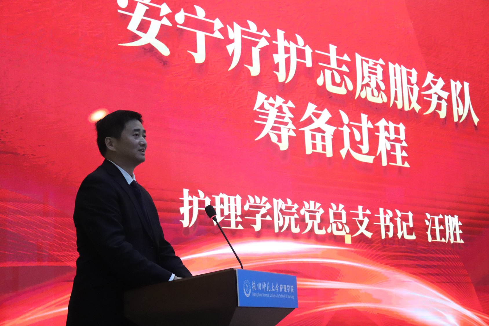大会第二项议程,我院党总支书记汪胜发表讲话,汇报志愿服务队的成立初心及筹备过程。汪书记回顾我院2019年开设安宁疗护课程、师生开展为老志愿服务的经历,强调了我院师生紧跟省市大健康发展战略,争做推动安宁疗护事业的排头兵。