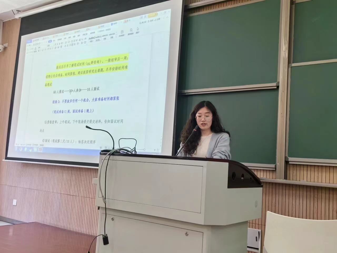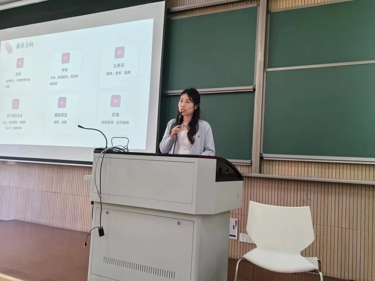 李静依学姐目前就职于浙江省肿瘤医院,她主要围绕就业方向、单位选择、应聘准备、应聘经验这四个方面进行她的分享,建议大家多渠道收集信息,比如公众号、就业指导群等,她指出要提前准备应聘,如各种文件和论文信息等需提前进行完善,其中考试形式是笔试和面试等。