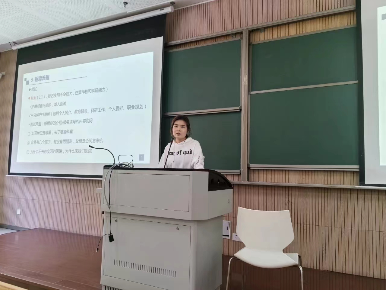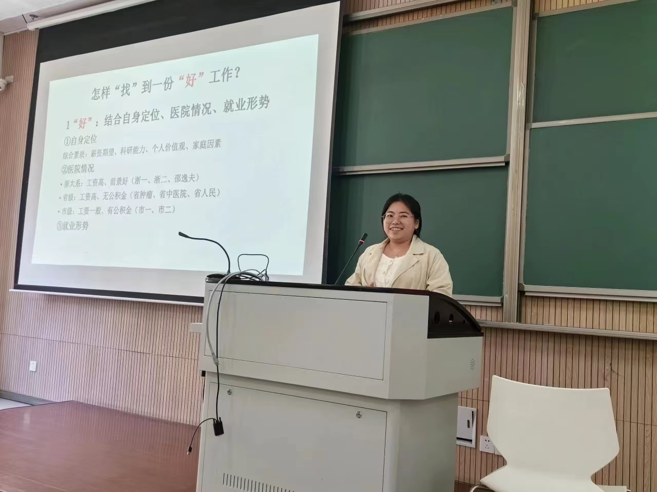杨晓珊学姐就职于杭州市第一人民医院城北院区,她主要从怎样找到好工作与怎样找到一份好工作两方面进行分享,学姐介绍找工作时应结合自身方向、医院情况,具体方法途径是关注公告和相关医院网站。最后学姐建议要多给自己留一份选择,保持阳光的心态,确信适合自己的才是最好的。