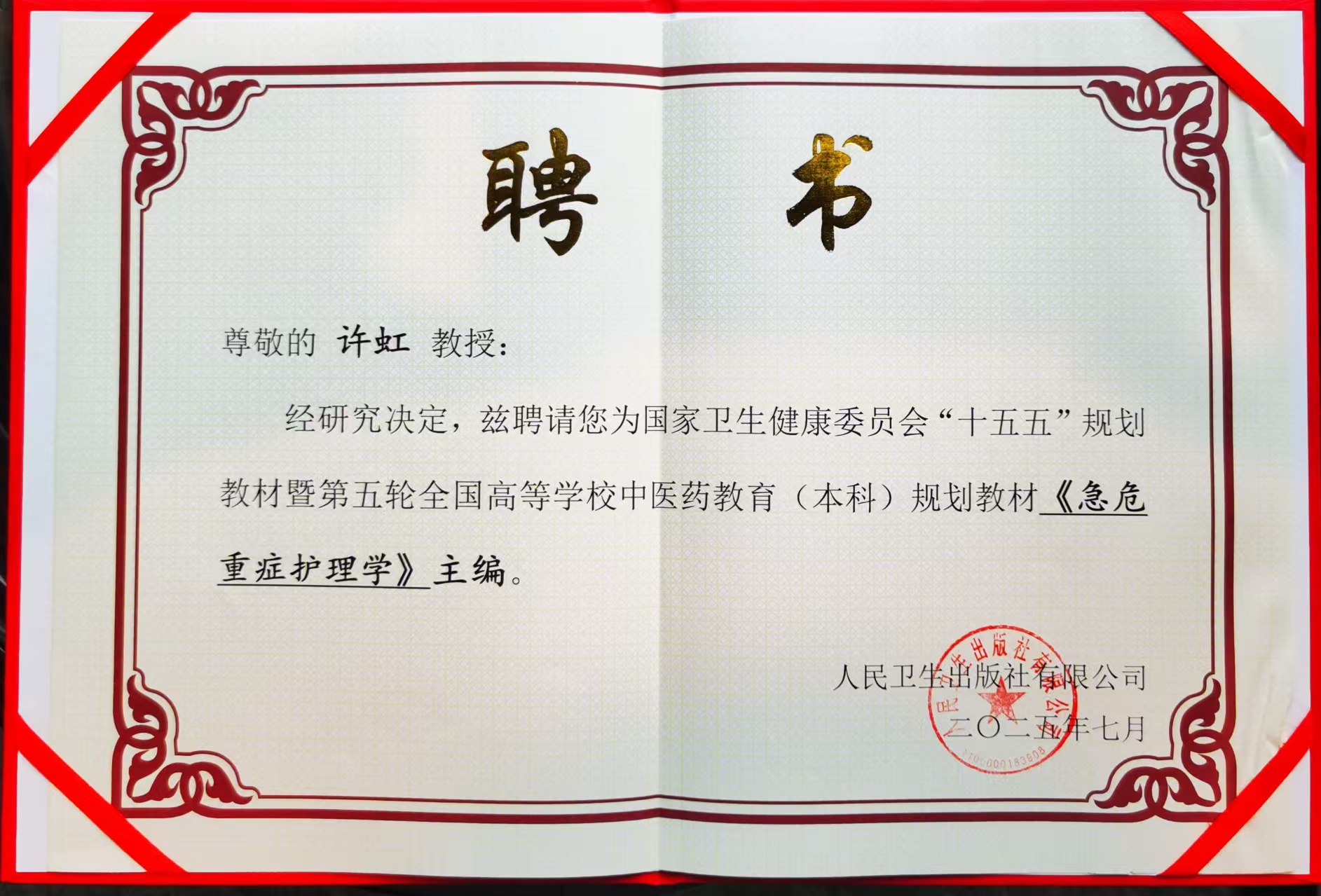 近日,国家卫生健康委员会“十五五”规划教材、第五轮全国高等学校中医药教育(本科)7个专业、118种规划教材主编、副主编人选确定,我校公共卫生与护理学院许虹教授再次当选本轮教材-《急危重症护理学》主编。