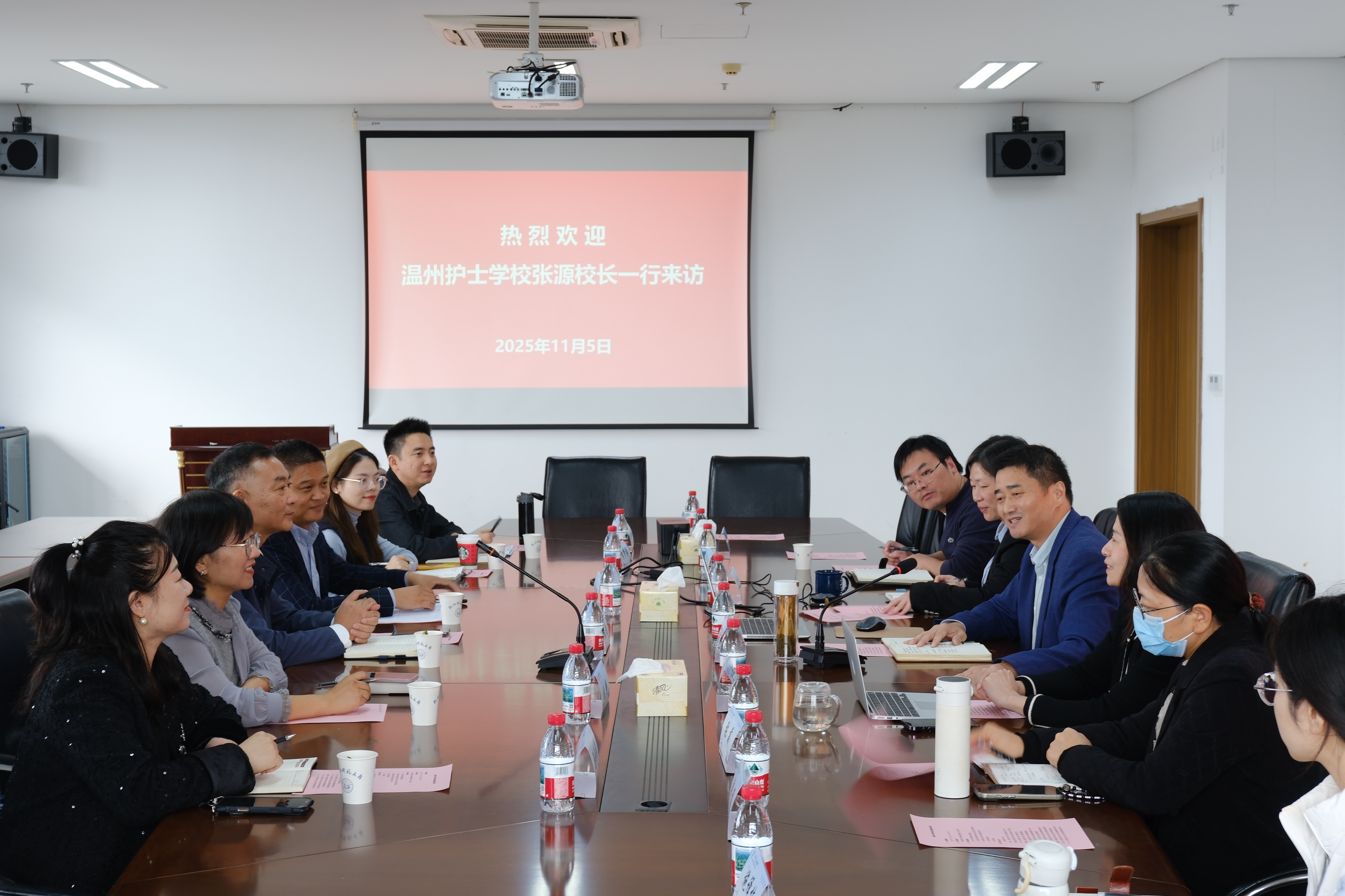 汪胜书记首先对温州护校一行来访表示热烈欢迎,并介绍了公共卫生与护理学院专业建设与发展情况。张源校长首先感谢我院对温州护校的支持以及对学生培养付出的努力,然后介绍了温州护士学校及学生培养情况。双方重点就中本贯通衔接、课程建设及师资培育等内容进行了深入的讨论,双方表示会在加强师资培训与科研能力提升等方面开展深入合作。