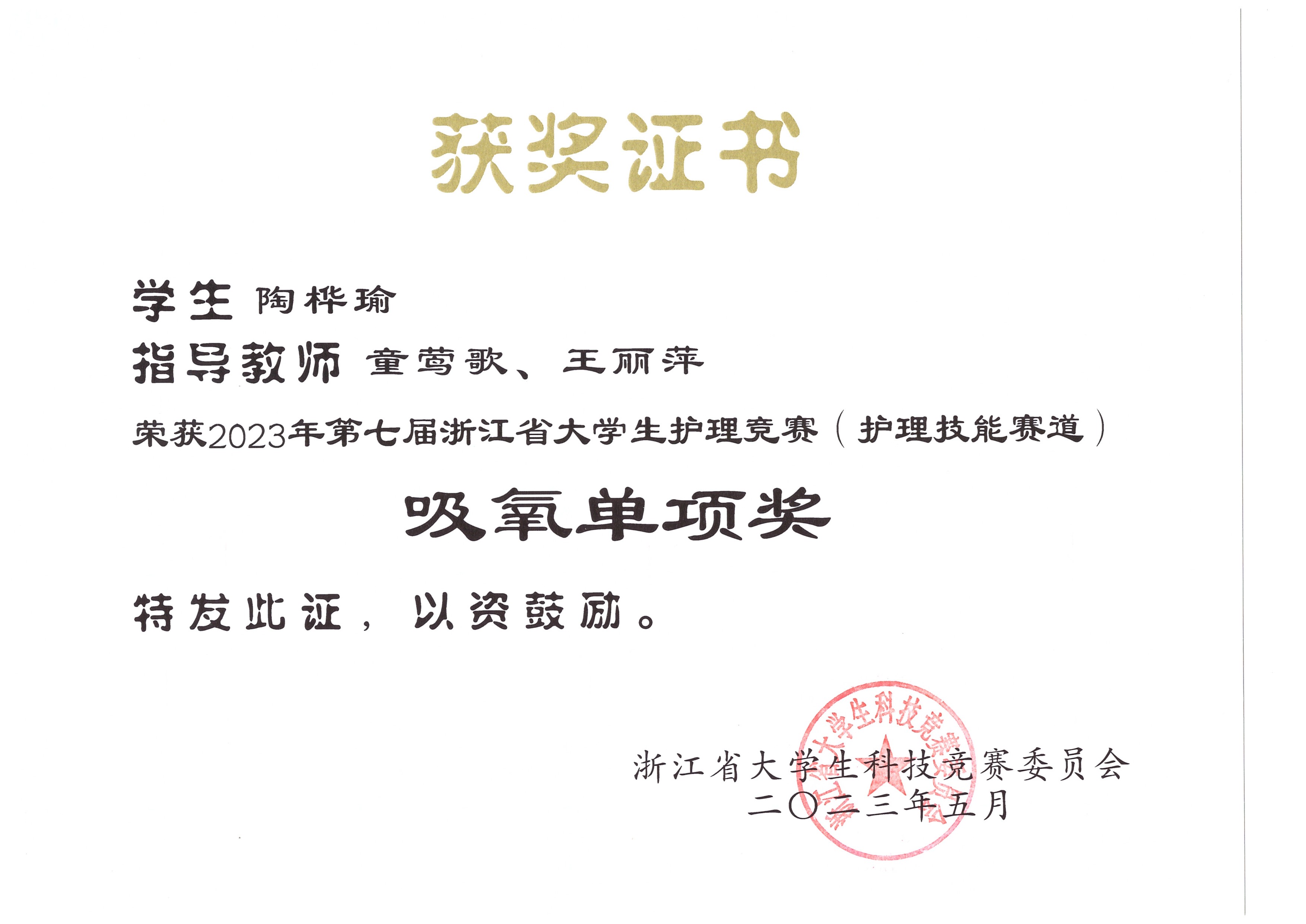 第七届浙江省大学生护理竞赛(护理技能赛道) 吸氧单项奖