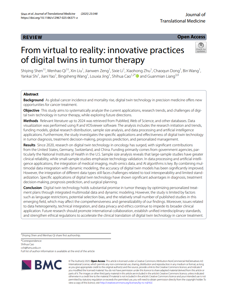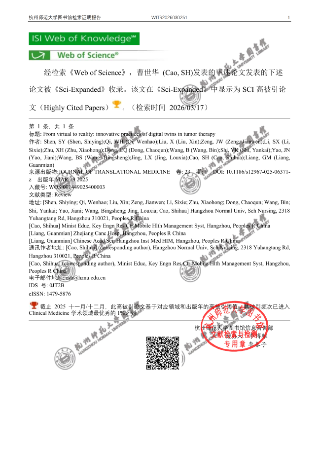 近日,我院教师曹世华课题组于2025年在JCR Q1期刊Journal of Translational Medicine (IF:7.5)上发表的研究论文“From virtual to reality: innovative practices of digital twins in tumor therapy”被ESI(基本科学指标数据库)高被引论文收录,标志着该研究成果在国际学术界获得了广泛关注与高度认可。曹世华科研团队长期致力于数字医疗与健康、护理信息化及智慧医疗等领域的交叉研究,目前在npj digital medicine、Journal of Medical Internet Research、Nurse Education in Practice和Journal of clinical nursing等国际权威期刊发表多篇学术论文。